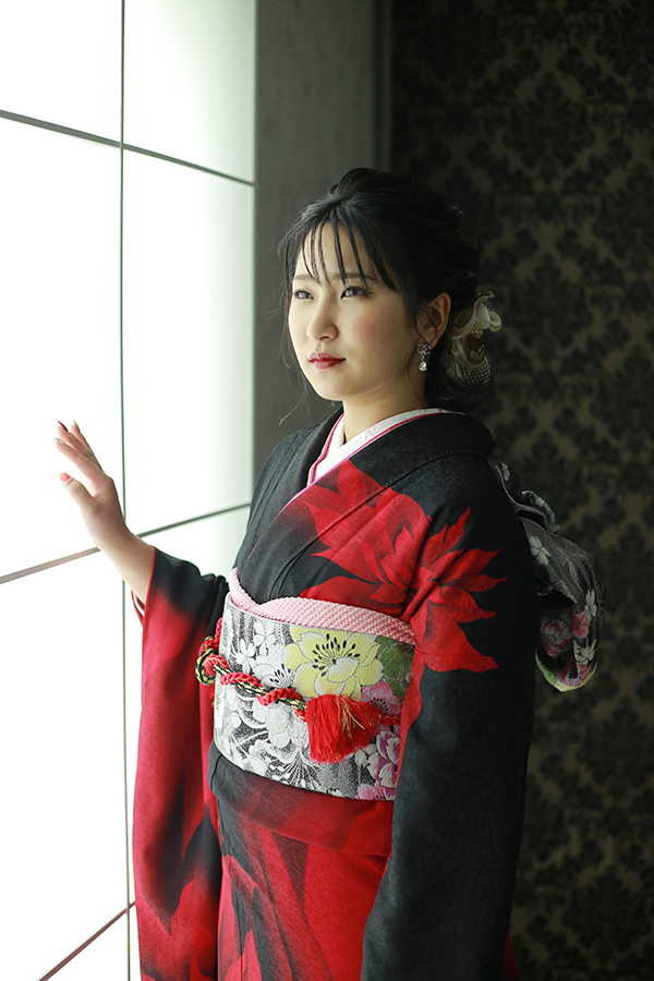 photo blog 2020年6月6日 かっこよく夜桜【可児市】 黒地のお着物に粋な赤い大きなお花柄が入ったcoolなお振袖 お嬢様の雰囲気にぴったりな、素敵な振袖セレクトです。 ご成人、おめでとうございます♪