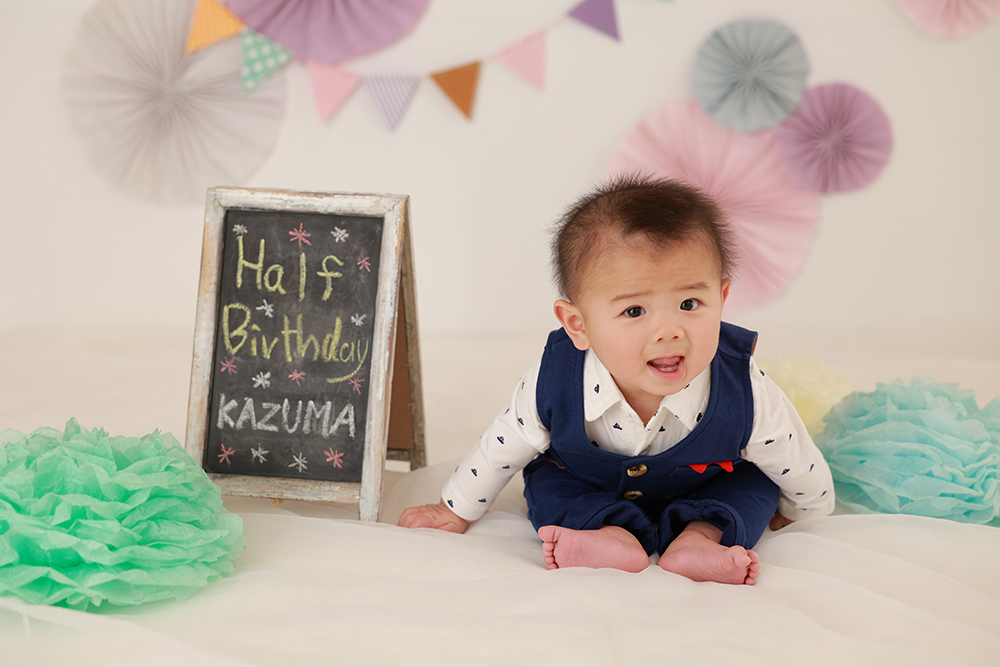 photo blog 2021年4月22日 初節句&ハーフバースデー【可児市】 初節句撮影に来てくれた7ヶ月の男の子 着物だけでなく、スーツを着てのハーフバースデー撮影もさせていただきました 金太郎さんにもなりましたよ かぶと持ち込みも大歓迎です