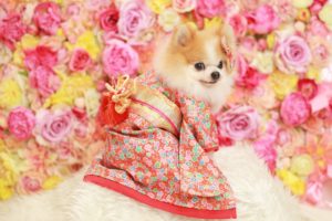 小型犬の男の子、女の子それぞれ1着ずつの衣装(着物)をご用意しております。